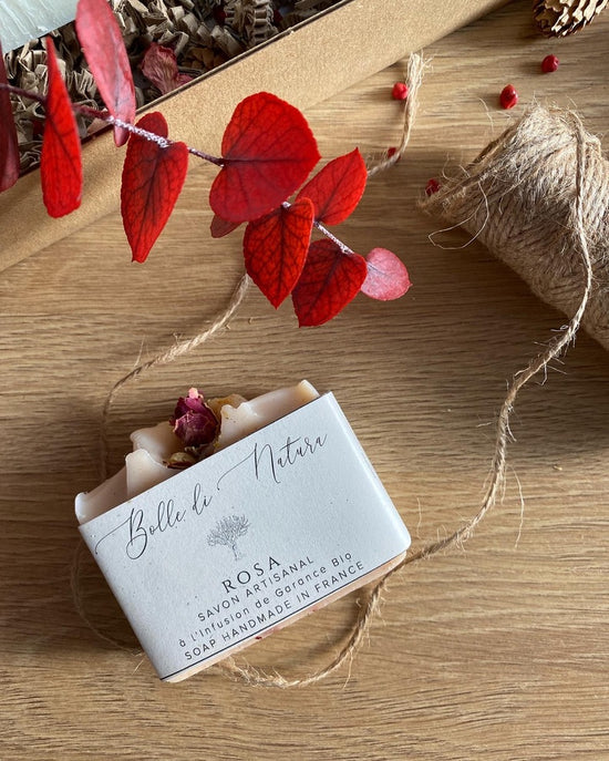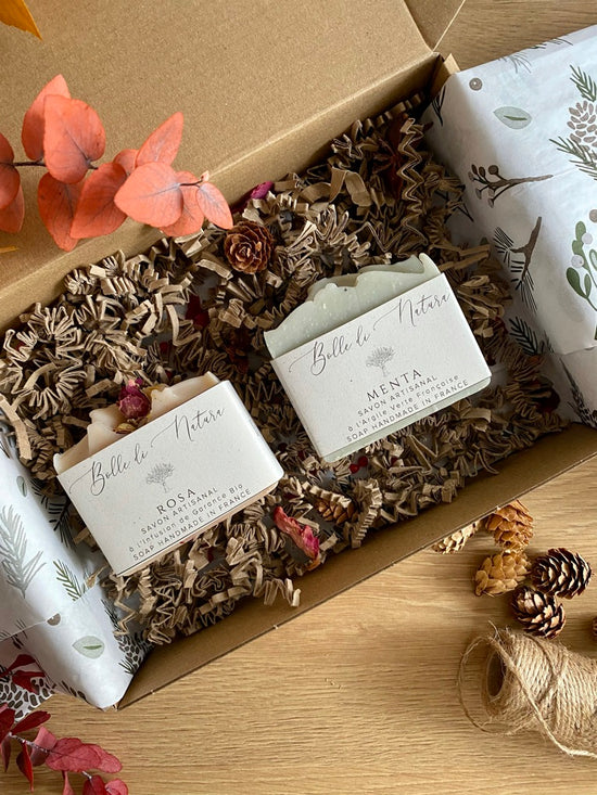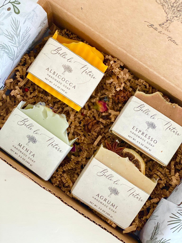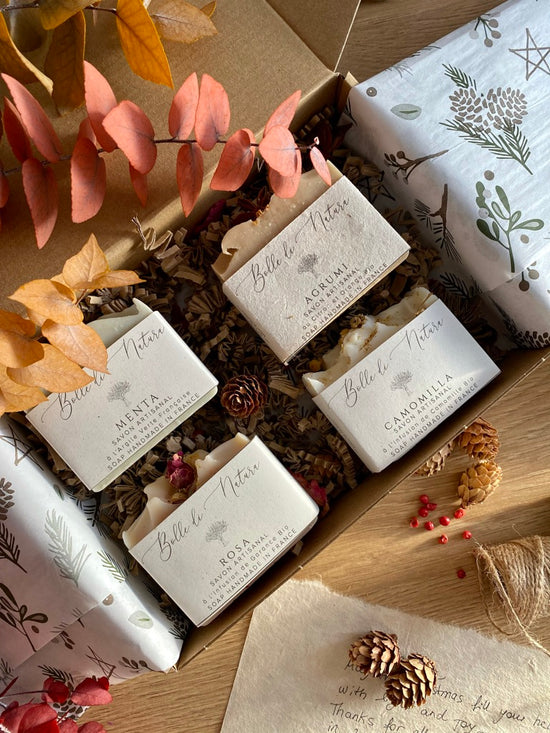 4 soap bars in a compostable, recycled and reusable box with gender neutral wrapping.