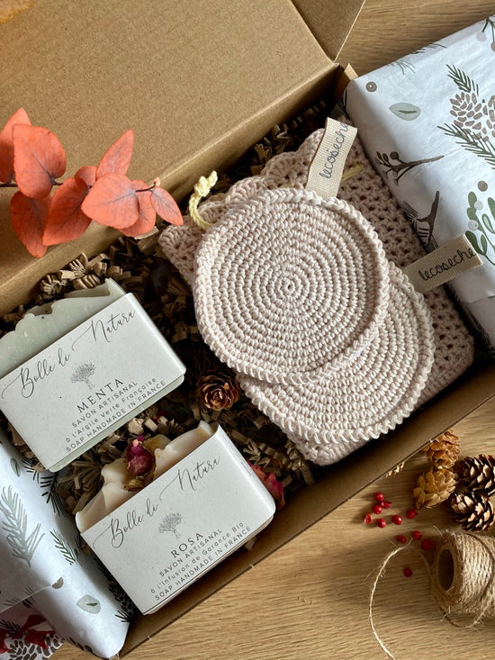 A luxury box with Italian handmade crochet face wipes + soap bag for your shower time skin exfoliation.
