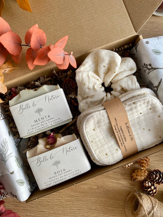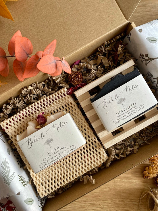 Ideal for a first timer: 2 soaps bars, an exfoliant pouch for the small leftovers + a dish.