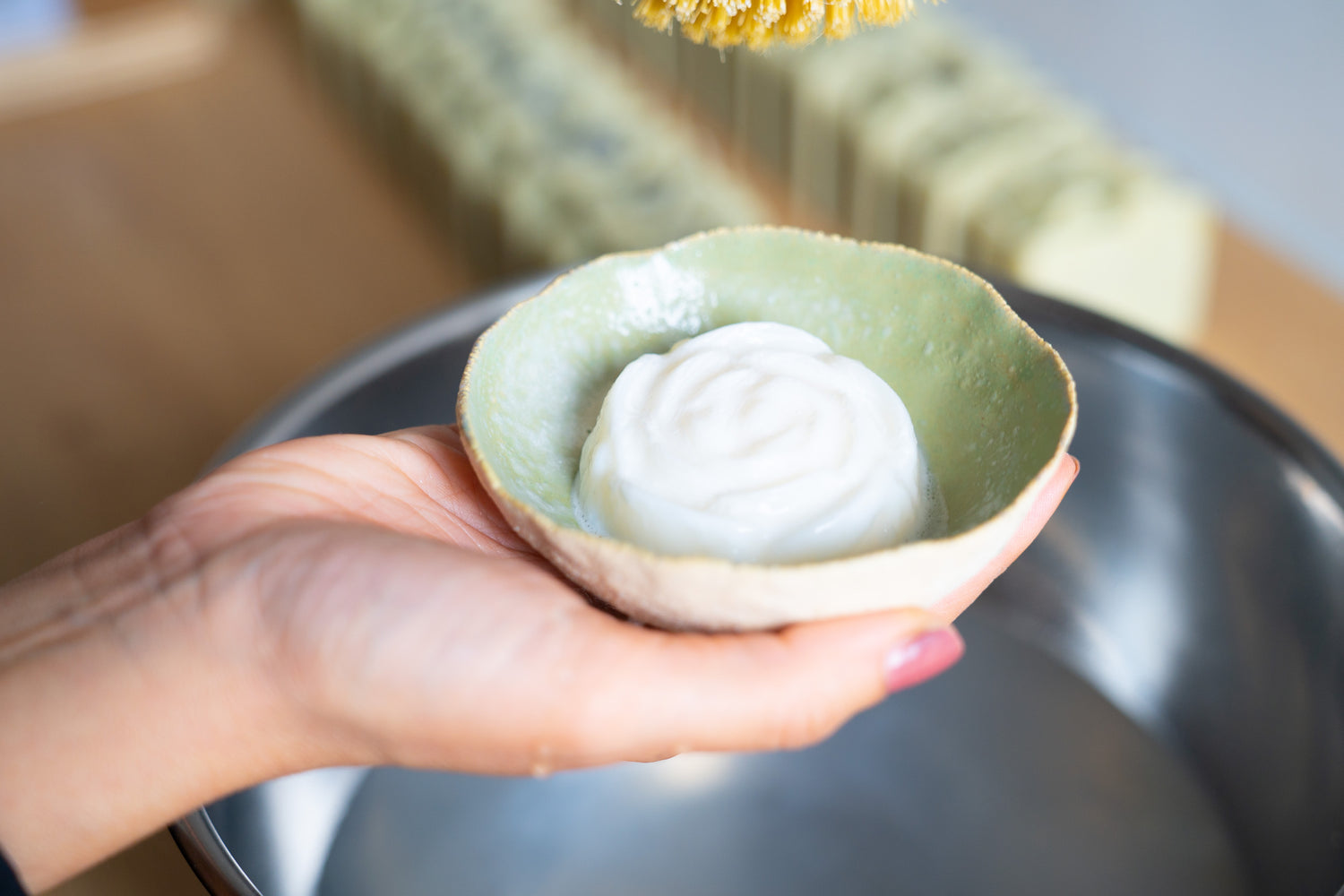 • Frottez votre éponge ou pinceau directement sur le savon solide.
